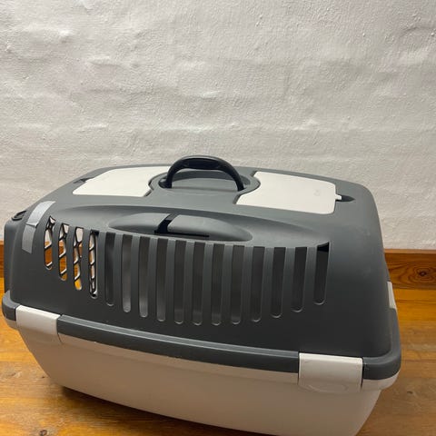 Transportkasse til kæledyr i hård plast, højde 30cm, bredde 33 cm og længde 48 cm. Kassen har rød bund og hvid top med ventilationsåbninger i siderne. Foran er der en aftagelig metalgitterdør, som kan åbnes og lukkes med skruelukninger. Kassen har bærehåndtag på toppen og er egnet til mindre kæledyr som kat eller lille hund til transport i bil eller ved dyrlægebesøg.