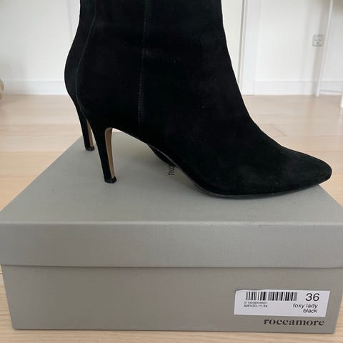 Støvlen er kun brugt indendørs ganske få gange og er derfor meget velholdt. Har fået et slag på højre hæl, der er ikke hul på ruskind, men et lille hak på hælen, som vist på billede.