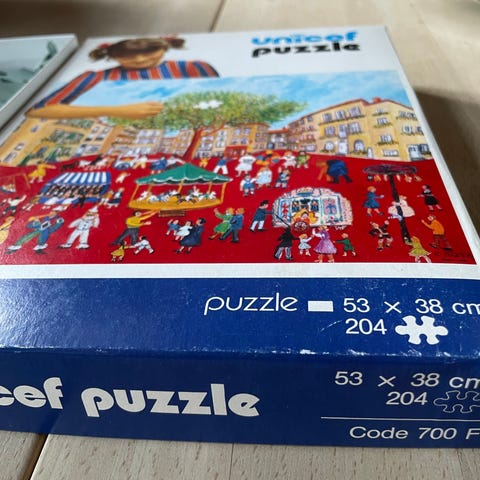 Unicof puzzle med rundt motiv, der forestiller børn, dyr og natur i en cirkulær opbygning. Puslespillet består af 204 brikker og måler ca. 41,5 x 49,5 cm samlet. Motivet er detaljerigt med figurer, fisk og dekorative mønstre i flere farver. Velegnet som puslespil til både børn og voksne, der kan lide illustrative og cirkulære motiver. På æsken er det angivet som code 701 E.
