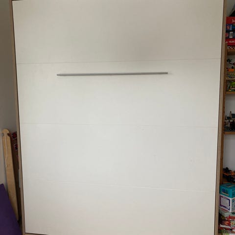 Flot og funktionel Nordic skabsseng i hvid, integreret i vægmodul. Sengen kan nemt klappes op mod væggen og fremstår som et stilrent skabselement med glat, hvid front, når den ikke er i brug. Perfekt til mindre boliger eller rum, hvor man ønsker at kombinere soveplads med opholds- eller opbevaringsplads.