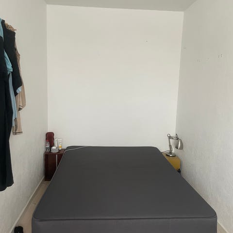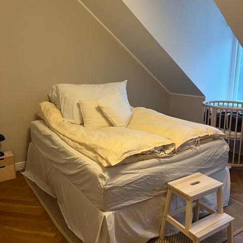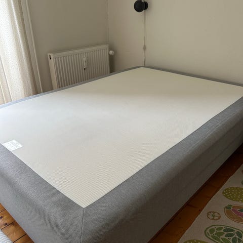 Sengen fremstår i god stand uden pletter eller skader – kun almindelige brugsspor. Den står stabilt på solide metalben, som nemt kan skrues af ved behov (fx til transport). Sengen er cirka 4 år gammel.