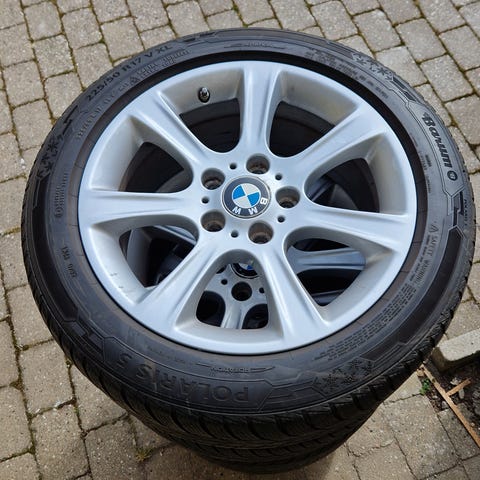 Der er tale om originale BMW alufælge i sølvfarvet aluminium med BMW-logo i navkapslerne. Dækkene er monteret på fælgene i størrelsen 225/55 R17, så du får et komplet sæt klar til montering.