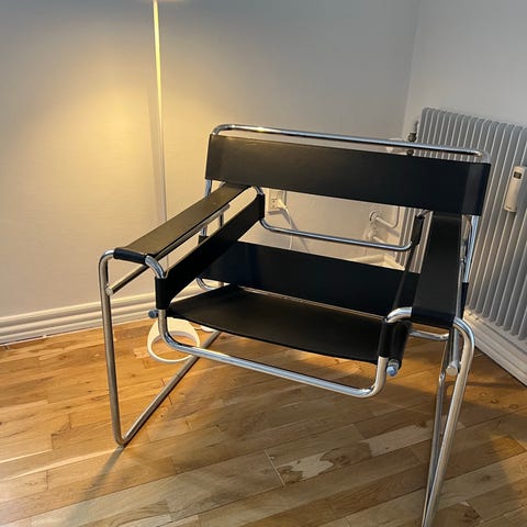 Sælger disse to sorte Wassily Chairs, der er i superflot stand. De er udført i sort kernelæder og med stel i forkromet stål. Enkelte småridser i stellet af almindelig brug (kan ikke ses, kun ved nærsyn) og ét mærke i læderet på det ene sæde (ses på foto), men ellers intet!