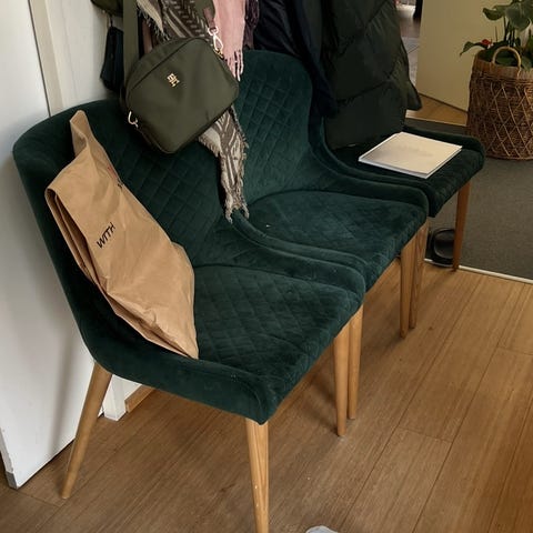 Spisebordsstole i grå velour og lyse egetræs ben sælges!