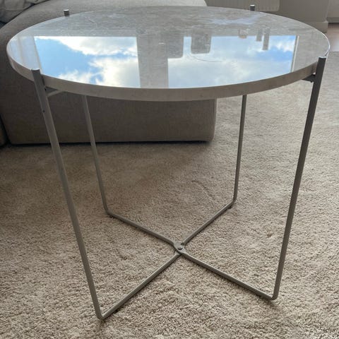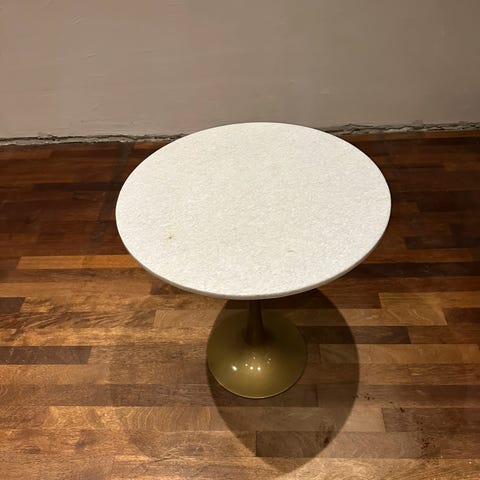 Lille rundt marmorbord og stol fra frisørsalon