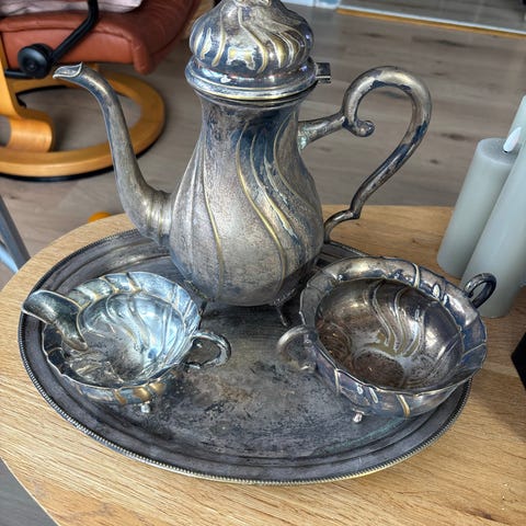 Tesæt bestående af tekande, sukkerskål og flødekande i sølvfarvet metal. Tekanden har hank og tud samt låg med guldfarvet top. Sukkerskålen har to hanke, og flødekanden har én hank og hældetud. Alle dele står på lille fod og har blank, spejlende overflade. Velegnet til servering af te, sukker og mælk/fløde ved borddækning.