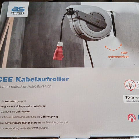 Mavel Roll Mega 400/30 kabelopruller med 30 meter kabel. Enheden er udført i hvid plast med sort centersektion. Ifølge mærkaten er den beregnet til 400 V installationer og har en kapacitet på op til 3,3 kW ved 400 V. Kabeloprulleren er velegnet til fast montering, f.eks. i garage, værksted eller lignende, hvor der er behov for et længere 400 V kabel, som kan rulles automatisk ind efter brug. Kablet afsluttes uden stik, klar til tilslutning efter behov og gældende regler.