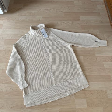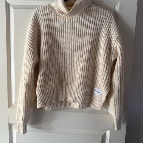 Calvin Klein rullekrave sweater til kvinder i str. S. Sweateren er i beige og fremstillet i 100 % uld. Klassisk rullekrave og lange ærmer. Egnet som varm trøje til hverdag eller arbejde, kan bruges alene eller under jakke eller frakke.