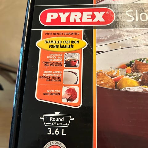 Pyrex SlowCook gryde på 3,6 liter i rød emaljeret støbejern. Gryden har to håndtag i siderne og låg med metalhåndtag. Indersiden er lys emalje. Velegnet til langsom tilberedning, simreretter og ovnretter. Kan bruges på komfur og i ovn, ifølge oplysningerne på emballagen.