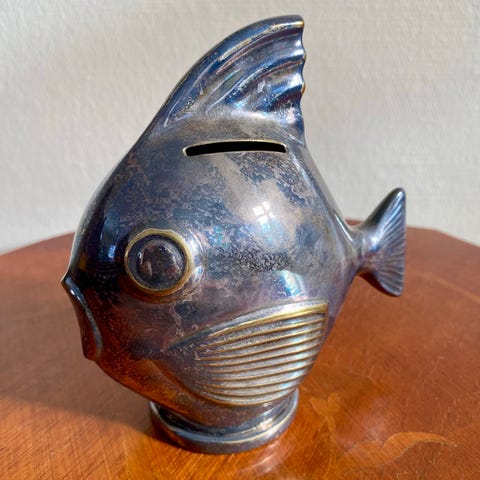Sparebøsse/sparegris formet som en liggende Bjørn med bold i sølv. Typisk dåbsgave