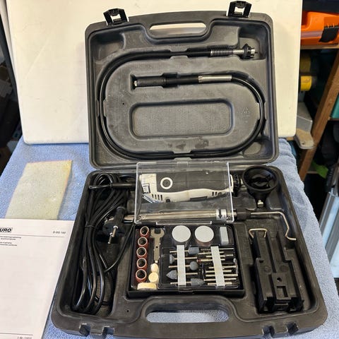 Dremel 300i multiværktøj i kuffert. Sættet indeholder elektrisk roterende multiværktøj med ledning, hårdt opbevaringsetui samt diverse tilbehør til slibning, gravering og anden finbearbejdning. Der medfølger skabeloner til bogstaver, tal og symboler, forskellige slibebånd og slibesten samt brugsanvisning til modellen. Velegnet til præcisionsarbejde i hobbyprojekter, modelbyggeri og mindre gør‑det‑selv‑opgaver på materialer som træ, plast og metal.