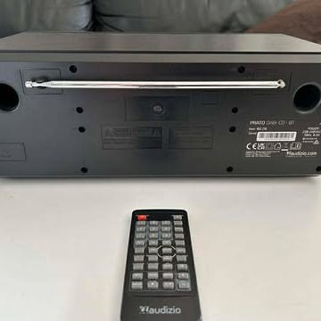 Audizio all-in-one musiksystem i sort. Enheden har frontbetjening med display, drejeknapper og flere funktionsknapper samt medfølgende fjernbetjening. På bagsiden findes tilslutninger til højttalere via skrueklemmer samt flere lydindgange og -udgange med RCA-stik. Systemet er egnet som central enhed i et hjemme- eller kontorlydsanlæg, hvor der er behov for tilslutning af eksterne lydkilder og passive højttalere.
