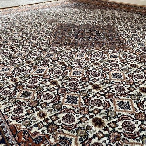 Meget velholdt uldtæppe i bordeaux og blålige farver.