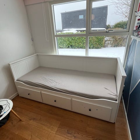 Flot udtræksseng med skuffer. Grå. Fra IKEA. Hemnes. Nypris 2900 kr. Den har småskrammer som vist på billederne, og en af skufferne skal sættes fast igen på dens bagvæg. Er ikke forsøgt og tænker den bare lige skal skrues på Se billeder. Madrasser medfølger ikke