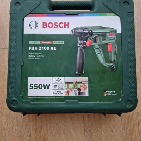 Bosch PBH 160 R borehammer med 420 W motor. Ledningsdrevet model til boring og hammerboring. Maskinen er grøn med sidehåndtag og standard 230 V stik. Oplysninger på typeskilt: 230 V, 50 Hz, 1,8 A, 420 W, borekapacitet op til 13 mm i stål og 30 mm i træ ifølge mærkningen på huset. Velegnet til almindelige bore- og slagboreopgaver i hjemmet.