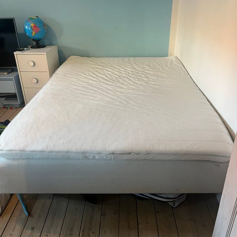 IKEA Sultan Slåstad seng i grå betræk. Den er nogle år gammel og har slid på fjedrene som kan høres en smule. Der medfølger også en topmadrqs hvis man er interesseret i det, men den er slidt og tydelige brugsspor. Sengen måler 55cm i højden fra gulvet og 200cm i længden og 120cm i bredden. Kan afhentes i taastrup.