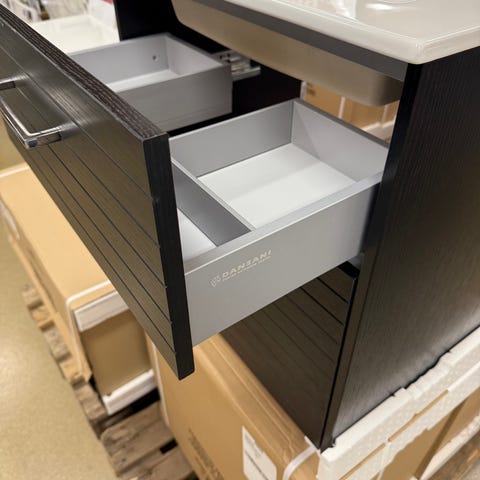 Dansani badeværelses overskab i natur eg. Væghængt og med åbning til højre. Indeholder 2 glashylder med slebne kanter. Der mangler 3 hyldebærere som den sidste hylde kan hvile på. Mål: 80x40x19. Velholdt