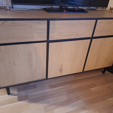 Sort skænk i metal med 3 glaslåger og glashylder.