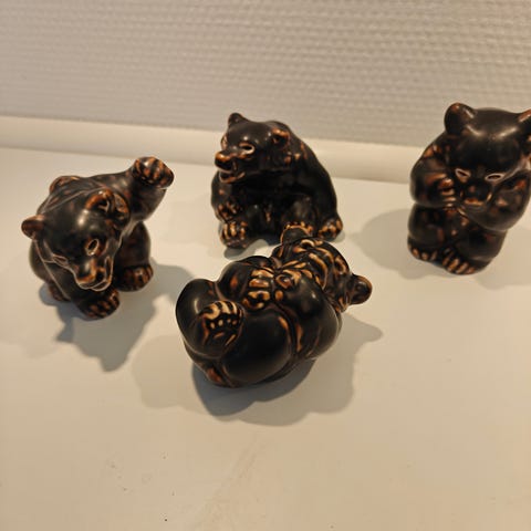 Kongelig porcelænsfigurer forestillende tre små bjørne i forskellige stillinger. Figurerne er udført i brun glasur med lysere detaljer. Undersiden er mærket med kongelig porcelæn stempel og modelnumre. Egnet som dekoration eller til samling af porcelænsfigurer.