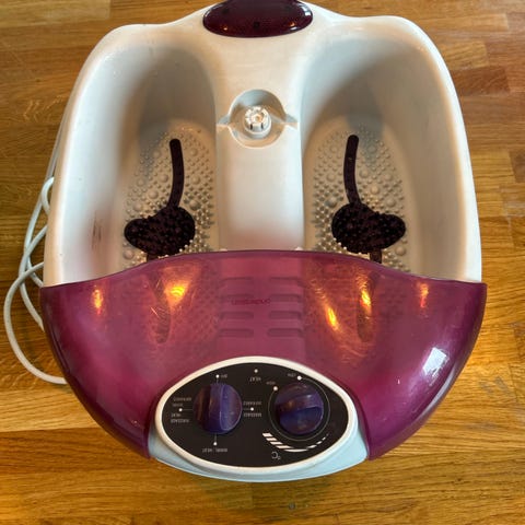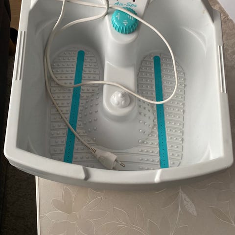 fodspa med massagefunktion i hvid og turkis plast. Fodspaet har rillet bund med massageknopper, aftageligt stænklåg og betjeningsknap på fronten til indstilling af funktioner. Velegnet til fodbad og let fodmassage i hjemmet. Tilsluttes med ledning til almindelig stikkontakt.