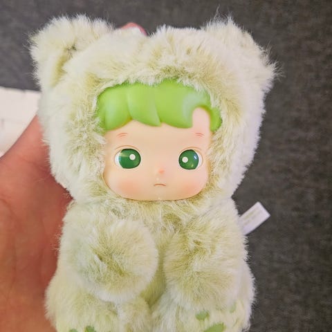 Pop Mart Big Big Girl Happiness nøglering i plysmateriale. Figuren forestiller en lille karakter i lyserød, fluffy dragt med kaninører. Nøgleringen har ophæng i toppen, så den kan sættes på taske, nøglebundt eller rygsæk. Leveres med original pose og tilhørende kvittering, som ses på billedet.