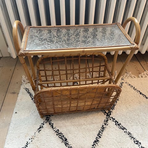 Sidebord med matteret glasplade i mønster. Med avis/magasinholder under glaspladen.