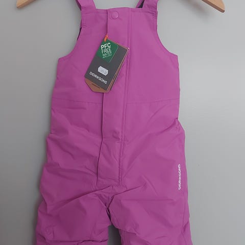 Model Tarfala - højtaljet børne skibukser i str. 100 i farven lyserød. Der er seler og frontlynlås. Materialet er polyester.