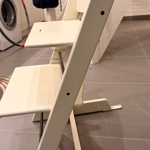 Stokke Tripp Trapp højstol i sortmalet træ. Klassisk justerbar højstol med flytbar sæde- og fodplade, der kan tilpasses barnets højde. Egnet til brug ved spisebordet for børn i forskellige aldre. Stolen har synlige brugsspor og afskalninger i malingen flere steder, som vist på billederne.