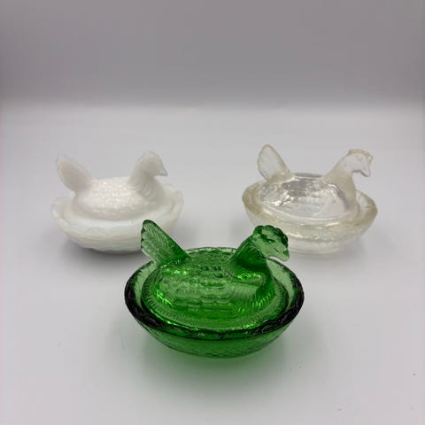 Porcelænsfigurer forestillende to små høns. Figurerne er udført i glaseret porcelæn i flerfarvede nuancer med blandt andet blå, grønne og brune toner samt lyserød kam. Begge høns står på små runde sokler. Velegnet som dekoration i vitrineskab, på hylde eller som del af en samling af porcelænsfigurer.