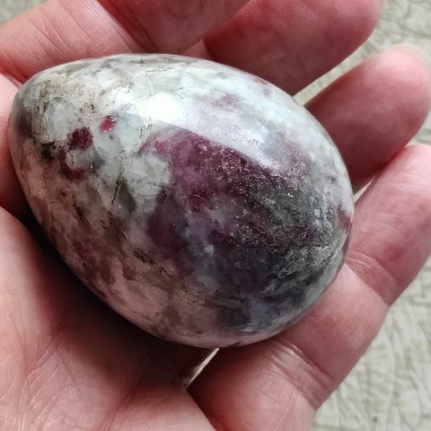 Rå mineralsten med pink rubin. Stenen fremstår i naturlig, ubehandlet form med ujævn overflade og mindre brune partier. Længden er omkring 5 cm, som vist ved lineal på billedet.