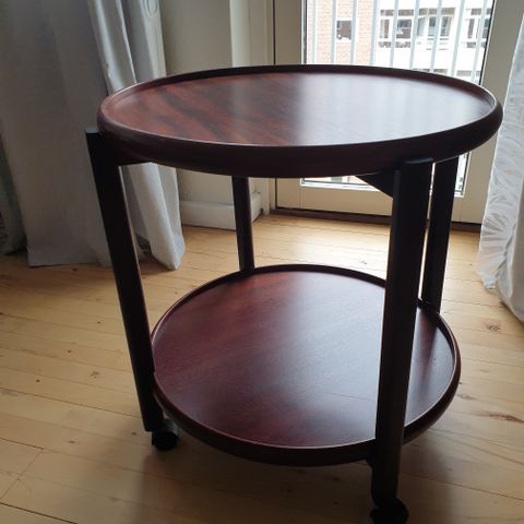 Smukt bakkebord med smedejernsstativ og bakke af mexikansk træ. Har en enkelt meget svag skjold på pladen som kan poleres vægt (og derfor den lave pris)