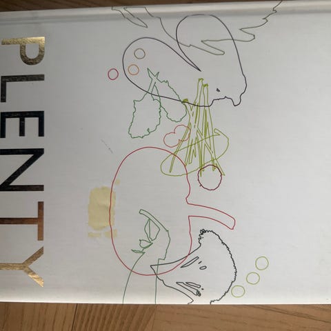 Yotam Ottolenghi Plenty More kogebog. Hardback-udgave med hvid forside og farverig grydeillustration. Bogen indeholder opskrifter med fokus på grøntsager og moderne køkken. Teksten er på engelsk.
