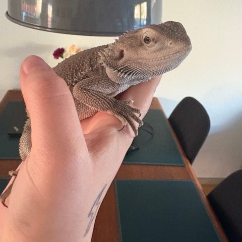 Salami er en skægagame på 6 år. Vi tror det er en hun, og hun er stille og rolig. Hun kan godt lide at rende frit, eller gå tur ude om sommeren i sin sele. Hun sælges med terrarie og alt tilbehør til et godt hjem.