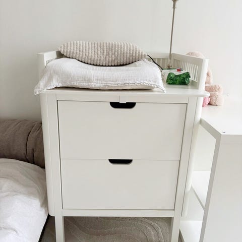 Done by Deer puslebord med hylder i hvid. Puslebordet har en stor pusleflade med kant hele vejen rundt. Under puslepladen er der åbne rumdelte hylder i flere sektioner til opbevaring af bleer, tøj og tilbehør. Puslepladen kan tages af og den kan bruges som en kommode.