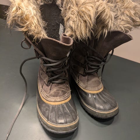 Sorel vinterstøvler i størrelse 42. Støvlerne er i brun farve med sort gummisnude og lys kant. Overdelen er i robust materiale med snørelukning foran og høj skaft, som giver støtte omkring anklen. Indvendigt er der blødt, fleece-lignende fór, der dækker hele skaftet for ekstra varme. Ydersålen er i mønstret gummi, som er egnet til våde og kolde underlag. Velegnet som vinterfodtøj til hverdagsbrug og udendørsaktiviteter i koldt vejr.