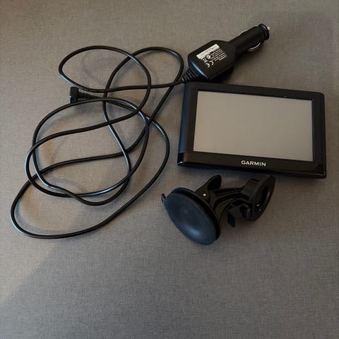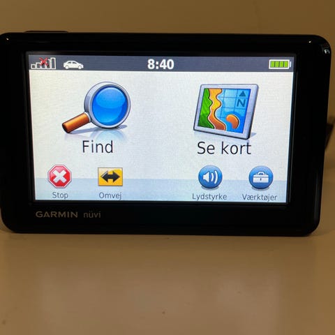 Garmin nüvi GPS navigation. Enheden leveres med flere kabler og opladere, herunder biloplader og USB-kabel, samt holder til montering i bil. Egnet til brug som bilnavigation med mulighed for strømforsyning via cigarettænderstik og tilslutning til computer via USB. Modellen leveres med original emballage som vist på billedet.