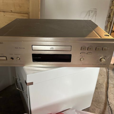 Denon DCD-755AR CD-afspiller i sølvfarvet kabinet. Fronten har display, bakke til indlæsning af cd’er samt knapper til afspilning, stop, pause, skip, random, display og tidsvisning. Der er hovedtelefonudgang på fronten med separat regulering af hovedtelefonlydstyrke.