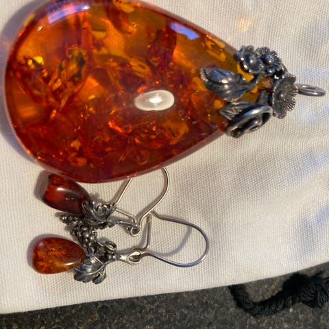 Vedhæng i rav. Så vidt jeg kan se, så er øjet i sølv. Der kan ses en nål fra nok gran, og de små næsten gennemsigtige flager/ skæl fra træet også. Meget pæn stand.