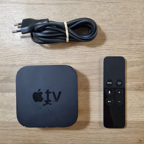 Apple TV 4K med modelnummer A1842. Medieafspiller i sort farve med medfølgende fjernbetjening. Understøtter HDMI 2.0a med op til 2160p opløsning samt Dolby Vision og HDR10. Enheden har gigabit ethernet, 802.11ac Wi‑Fi med MIMO og dual‑band (2,4 GHz og 5 GHz), trådløs Bluetooth 5.0‑teknologi og infrarød modtager. Velegnet til streaming af film, serier, musik og apps på tv.