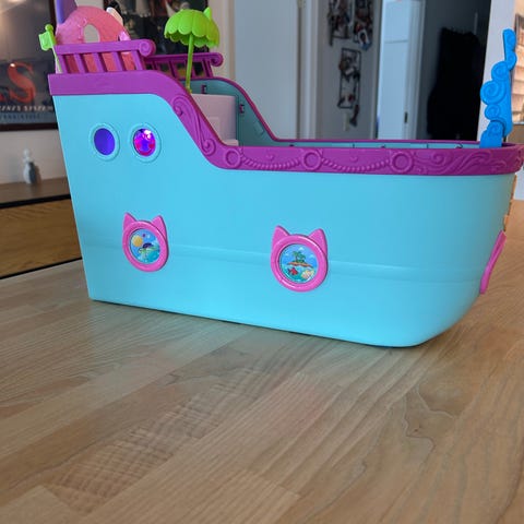 Gabby’s Surprise dukkehus med flere etager og rum. Huset har farverige vægge i turkis, pink og gule nuancer samt et tag formet som et kattehoved. Indvendigt er der forskellige legeområder, blandt andet badeværelse med badekar, toilet og håndvask, sove- og hyggeområder med seng og sofa, samt lege- og beautyområder med stol, bord og små møbler. Der medfølger flere små figurer og tilbehør som gynge, rutsjebane, borde, stole og andre små dele, der kan placeres rundt i huset. Dukkehuset er egnet til leg med små figurer og til indretning af de forskellige rum.