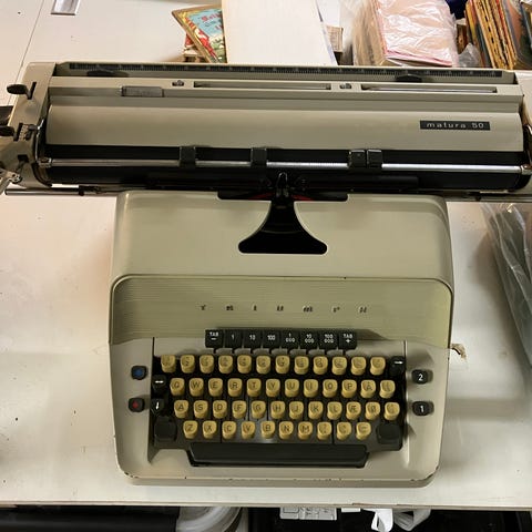 Fin skrivemaskine far 70érne. Der medfølger en opbevaringskasse samt brugsmanual. Den skal have et nyt farvebånd.