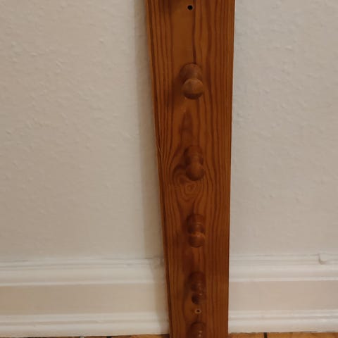 Sakse retro knagerække i fyrretræ. Der er 9 knager, der mangler en enkelt.