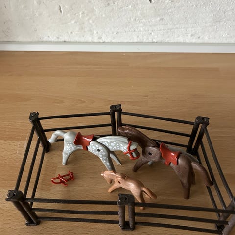 Blanding af Playmobil og Schleich. Spring, fold, stald, vaskeplads. Til mange timers leg for et barn der er vild med hest:)