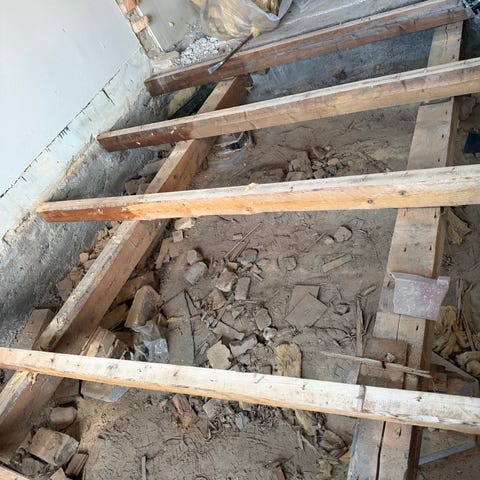 Bjælkerne fremstår som konstruktionstræ, tidligere anvendt i gulv. Egnet til genbrug i byggeprojekter, midlertidige konstruktioner eller andre formål.