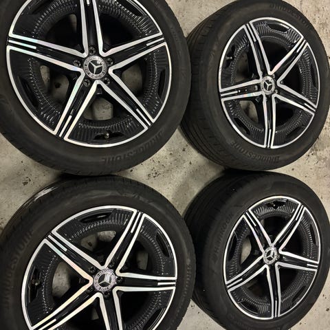 Jeg har et sæt AMG Alufælge med sommerdæk som helt nye har kørt en sommer fra en Mercedes eqe 350 sedan et 47.5 255/45 r19med bridstone sommerdæk ny pris 49000 til salg 16000 kr ingen hakker eller ridser kan træffes på telefon 28681558 Mvh Mr Brian Kresten Andersen