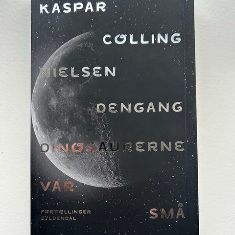 Niels Colling Nielsen "Dengang dinosaurerne var små" bog. Paperback med sort forside og motiv af måne/planet. Bogens tekst er på dansk. Velegnet til læsning for interesserede i fortællinger om dinosaurer og relaterede emner.