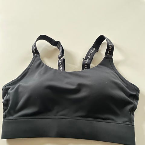 EYDA, model Shelly sports-bh til fitness til kvinder i størrelse XL. Modellen er sort og har bryderryg med udskæringer for bevægelsesfrihed. Bred elastikkant forneden giver støtte under træning. Materialet er glat og strækbart syntetisk stof, egnet til fitness og anden indendørs træning. Brugt en gang, købt for stor.