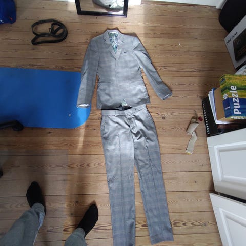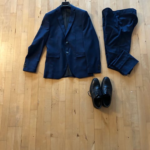 Jack & Jones jakkesæt til herre i str. S. Sættet består af blazer og bukser i blå polyester. Jakkesættet leveres med en hvid langærmet skjorte samt en Jack & Jones jakkepose til opbevaring og transport. Velegnet til formelle anledninger og arbejde, hvor der ønskes et enkelt, ensfarvet jakkesæt i let materiale.
