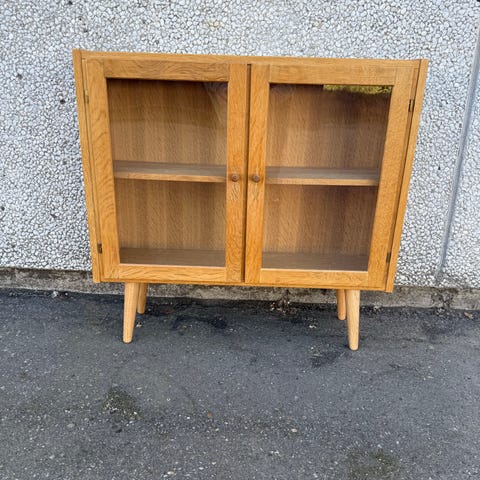 Vitrineskab i sæbebehandlet eg. Kan med fordel friskes op med sæbebehandling. Fra ikke ryger hjem. Sksl hentes i Spørring, mellem Århus og Randers.