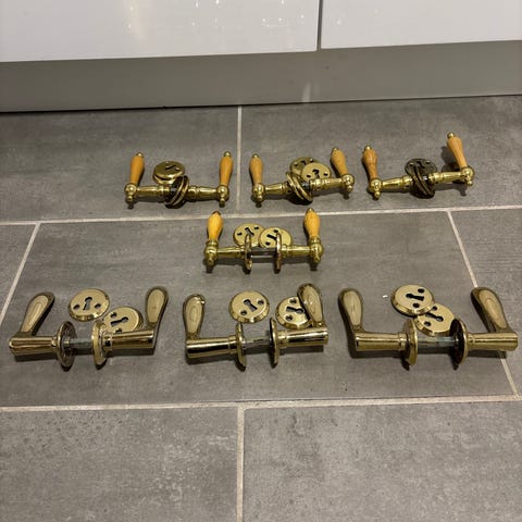 Møbelgreb og nøgleskilte i metal/messing i mørk bronzefarve. Klassiske, buede greb med runde beslag, velegnede til skuffer og skabe. Tilhørende nøgleskilte i matchende metal. Egner sig til montering på kommoder, skabe eller andre møbler, hvor der ønskes udskiftning eller supplering af eksisterende beslag.